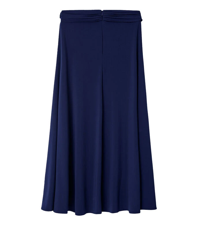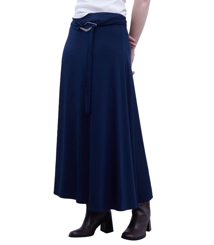 Falda Maxi Adolfo Dominguez; elaborada en tejido plano con detalle de cinturón fijo en cintura con sutil hebilla metálica y cierre de lágrima detrás.