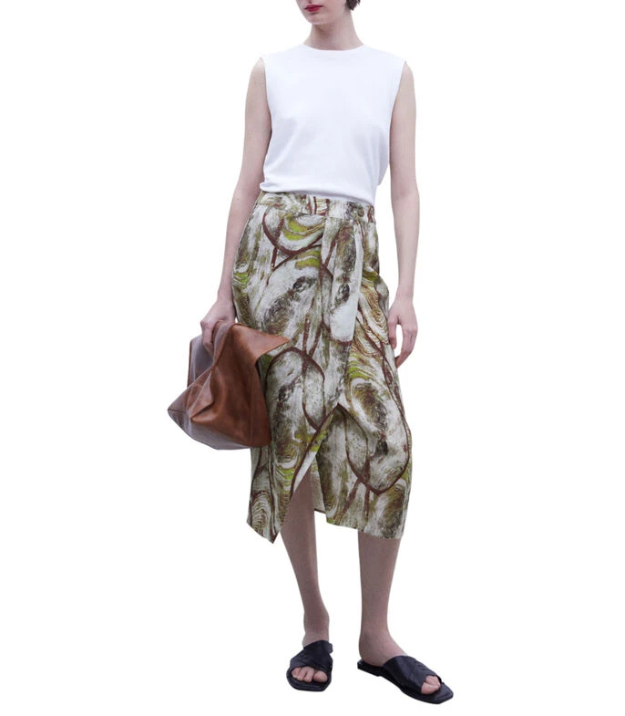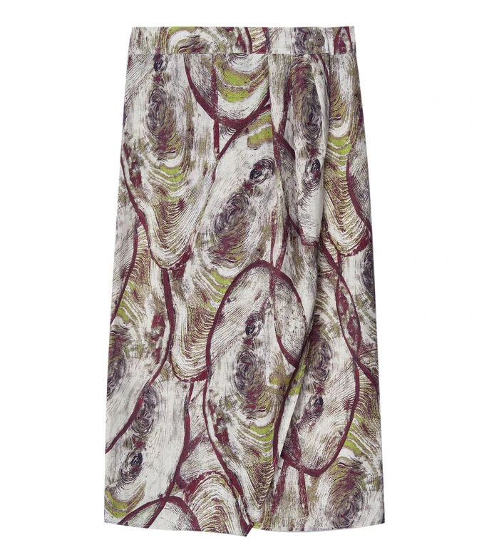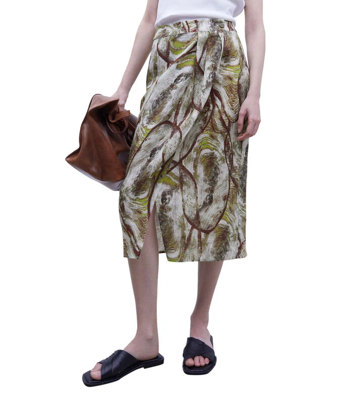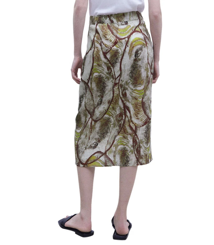 Falda midi Adolfo Dominguez de corte recto con estampado fantasía de líneas, siluetas y cierre de botón en pretina.