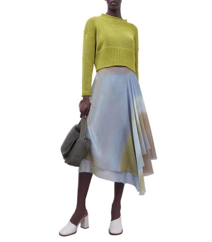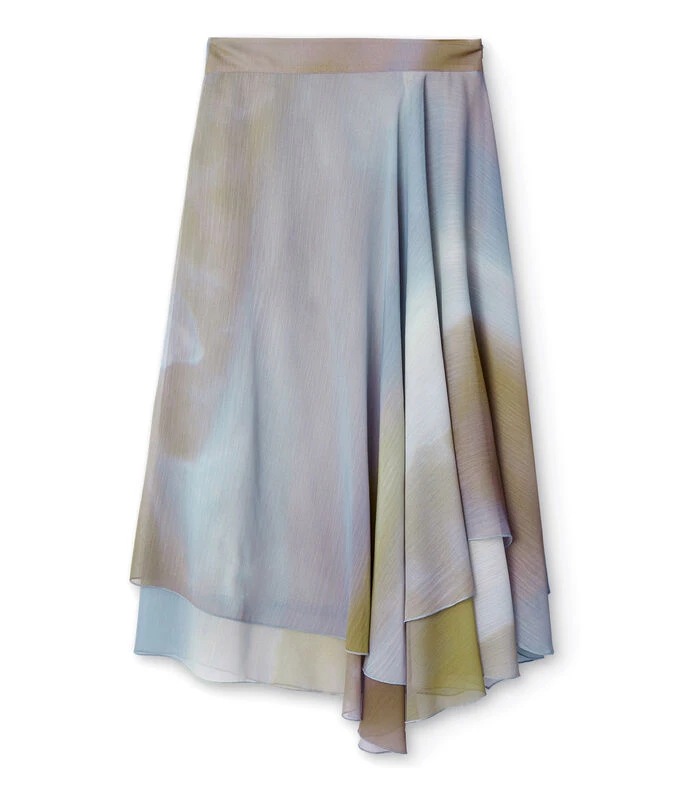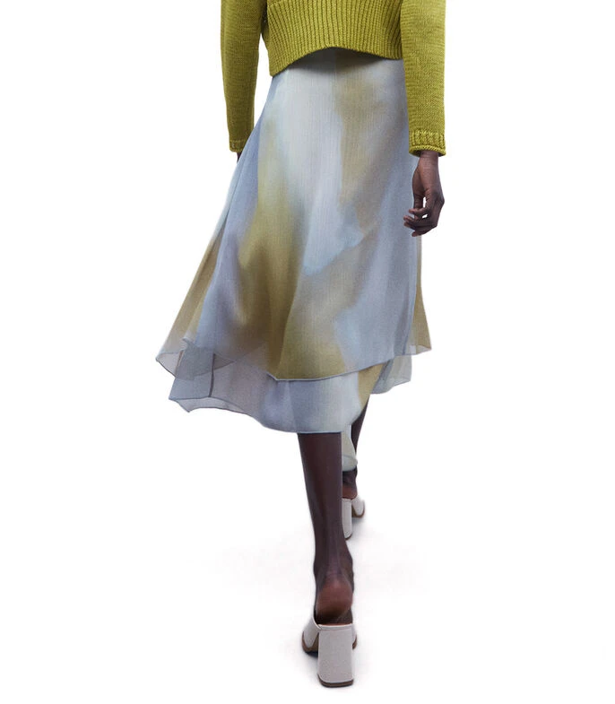 Falda midi Adolfo Dominguez de corte regular en tejido plano semitransparente de dos capas, print tipo tie-dye y cierre de lágrima en lateral.