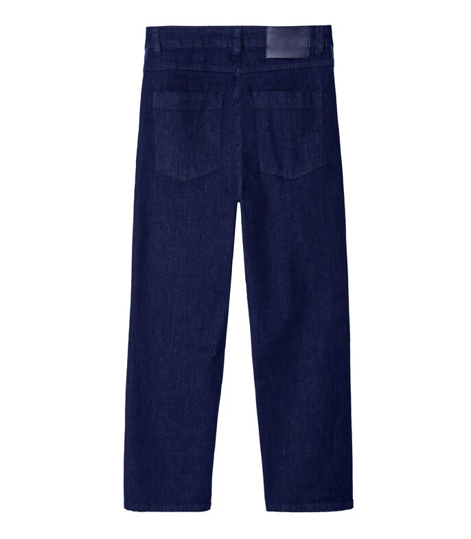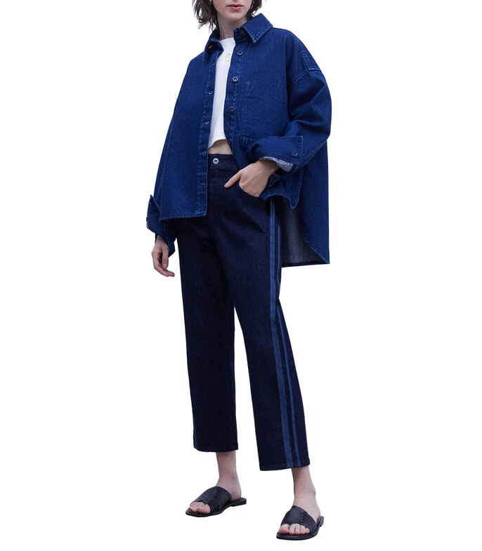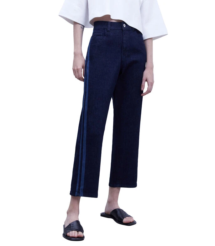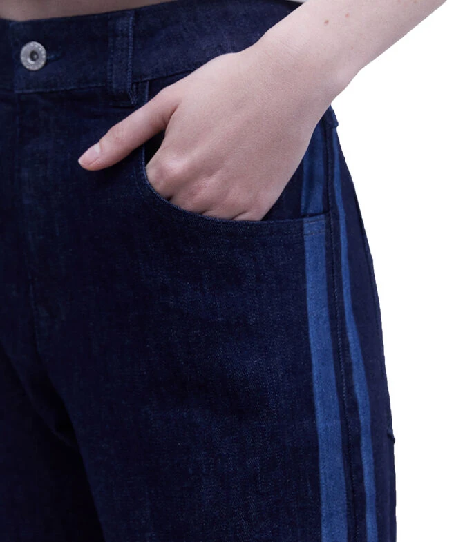 Jeans Adolfo Dominguez de corte recto con franjas en costados, bolsillos, botón metálico y cierre de cremallera.
