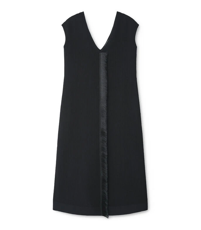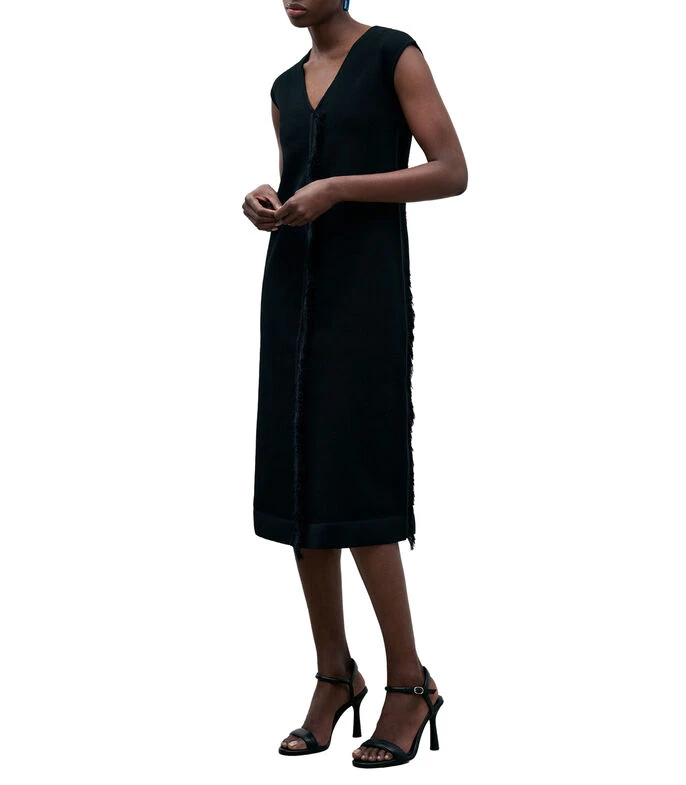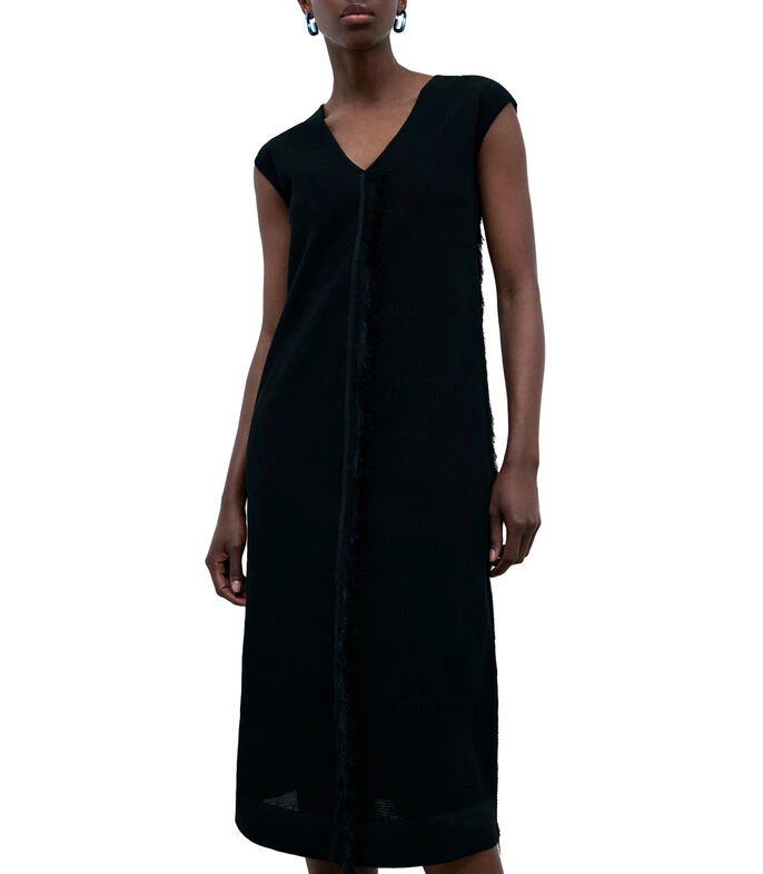 Vestido Adolfo Dominguez midi de corte recto en tejido de punto liso, cuello V, sin mangas y con flequillos a lo largo. Combínalo con tacones y accesorios sutiles para un look completo y deslumbrante.
