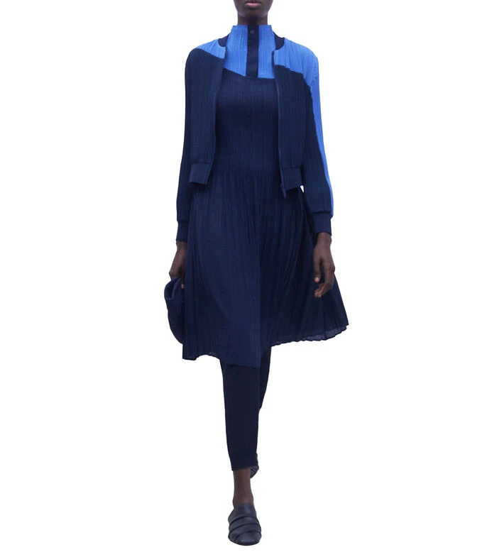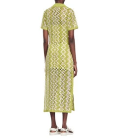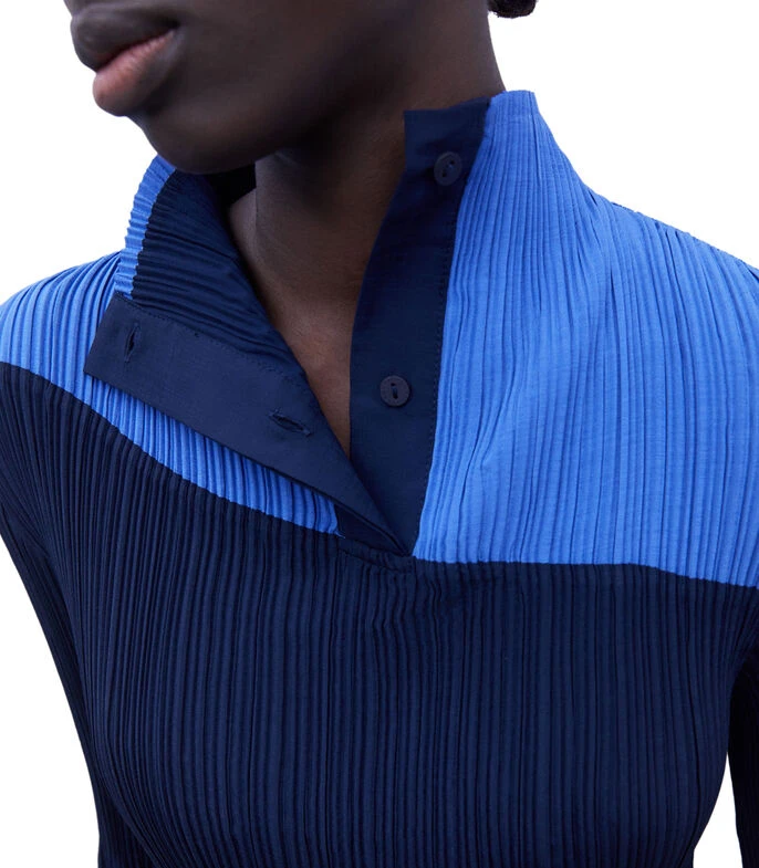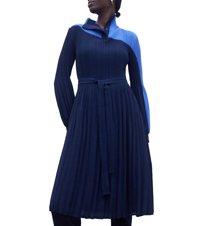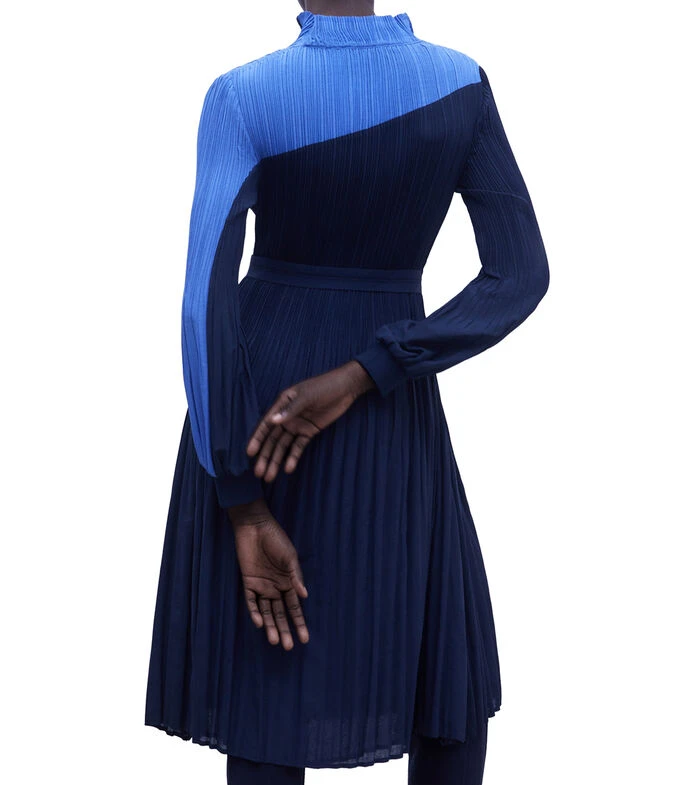 Vestido Adolfo Dominguez midi corte recto en tejido de punto con acabado tableado, diseño diagonal a contraste, cuello alto con botón, manga larga y cinta de ajuste a la cintura.