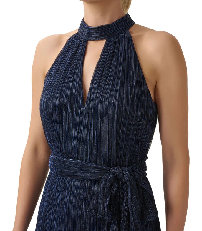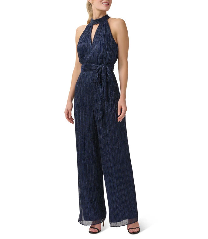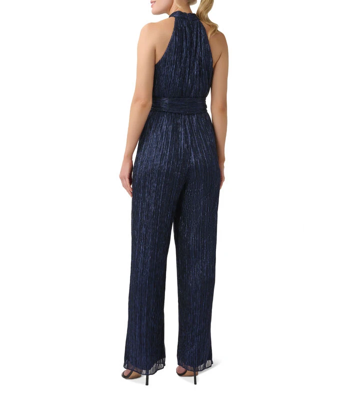 Jumpsuit de fiesta Adrianna Papell de corte recto en tejido de punto con aplicación de brillo, diseño de pliegues, elegante cuello halter y lazo en cintura.