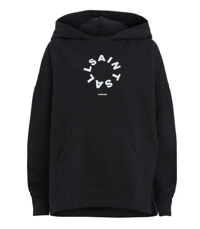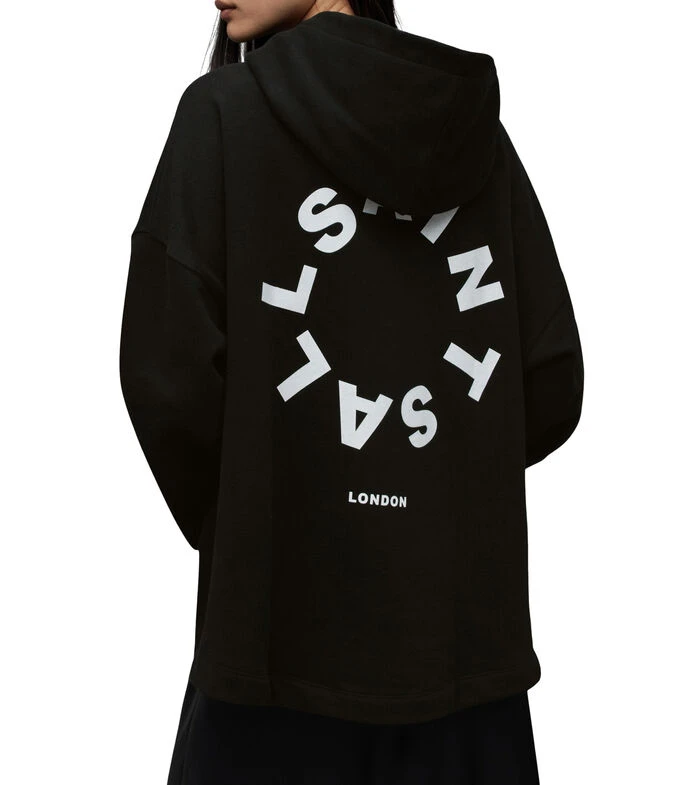 Sudadera AllSaints Étienne de corte oversized en tejido de punto con capucha, nombre de marca estampado tanto en parte frontal como en espalda, bolsillo tipo canguro y bordes acanalados.