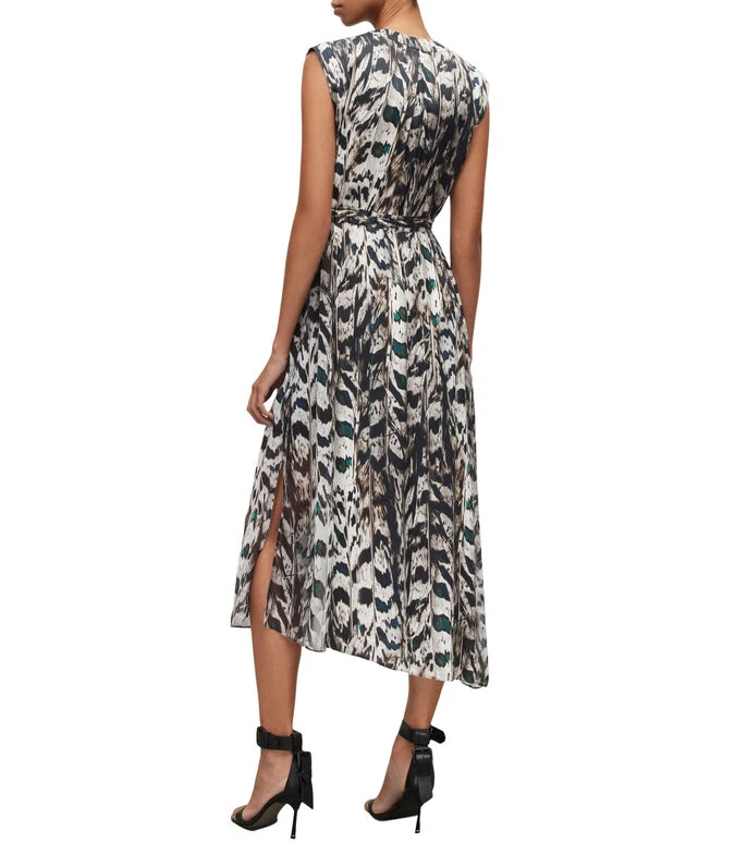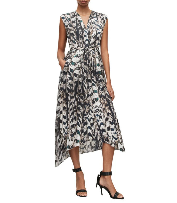 Vestido de fiesta midi AllSaints de corte recto en tejido de punto con estampado abstracto, cintura ceñida, cuello V, bolsillos laterales, líneas a tono y lazo de amarre.