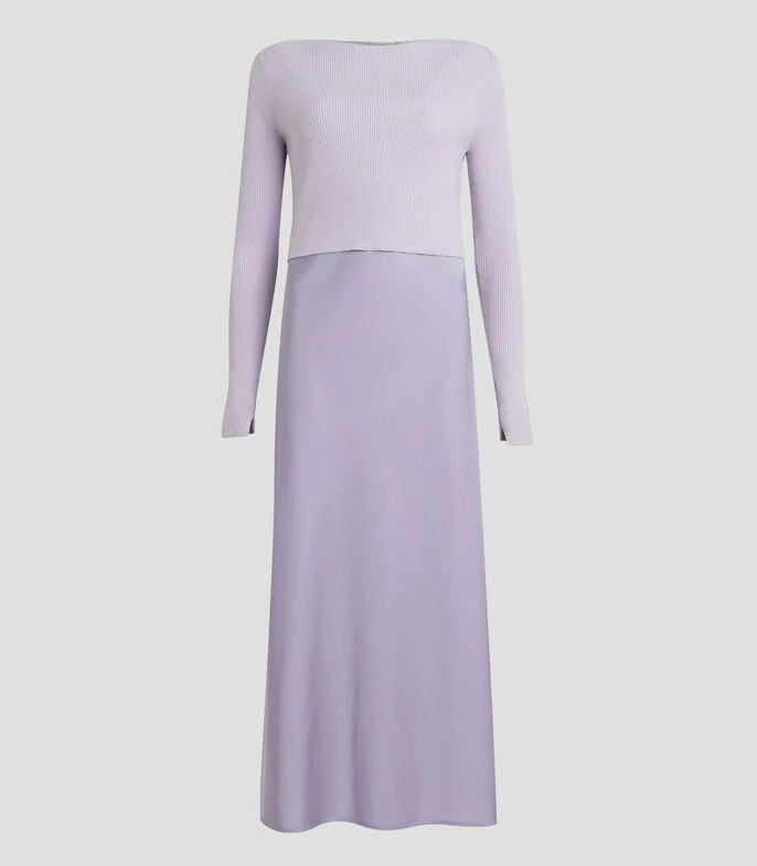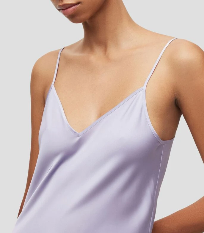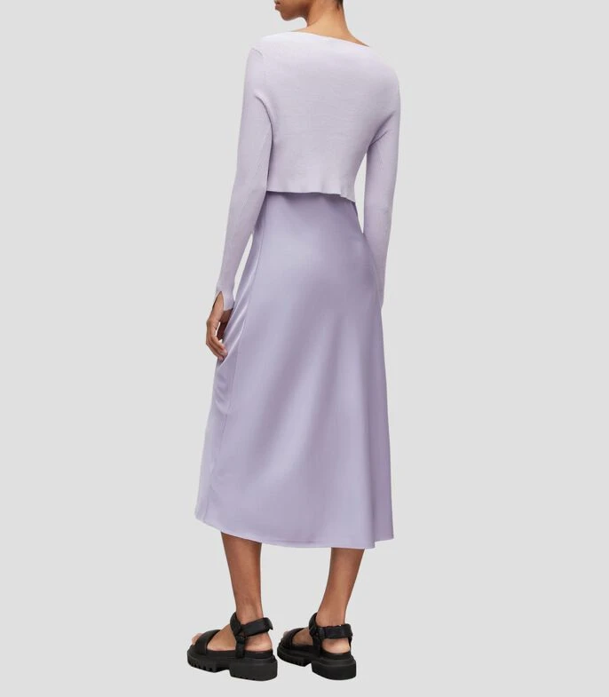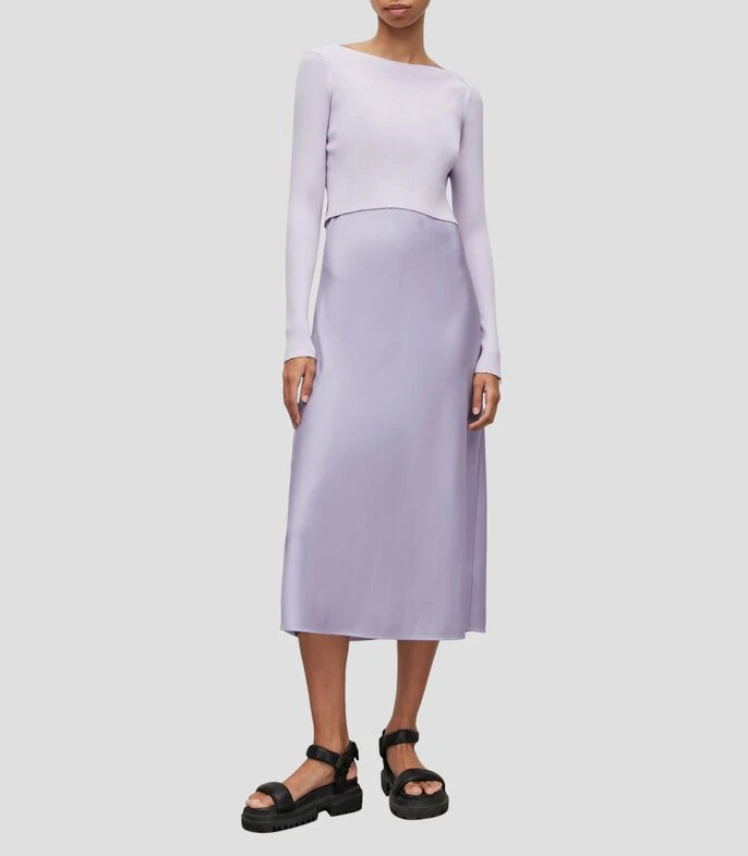 Vestido midi AllSaints Hera de corte recto en tejido de punto con acabado satinado, diseño sólido, cuello V sin mangas, con tirantes finos. Incluye suéter de corte crop.
