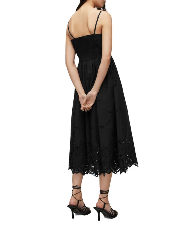 Vestido midi AllSaints Whitley de corte A en tejido de punto con tirantes ajustables, escote en espalda, detalles fruncidos, líneas en cintura tipo crochet y hermoso diseño calado sobre falda.