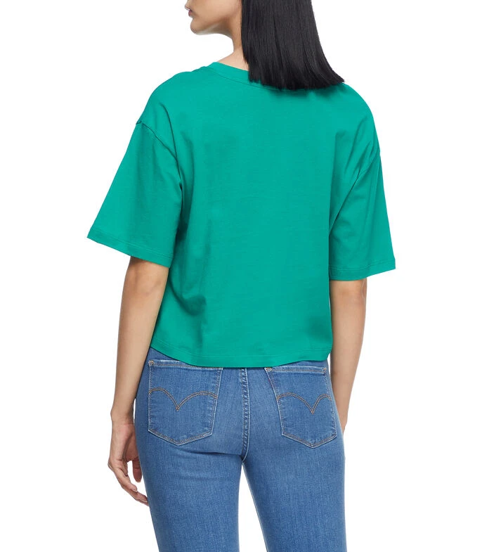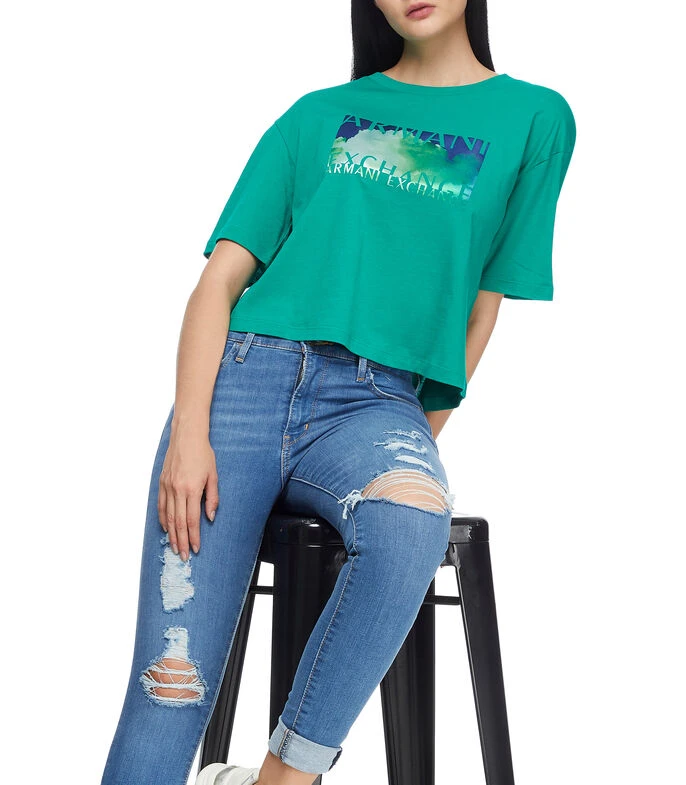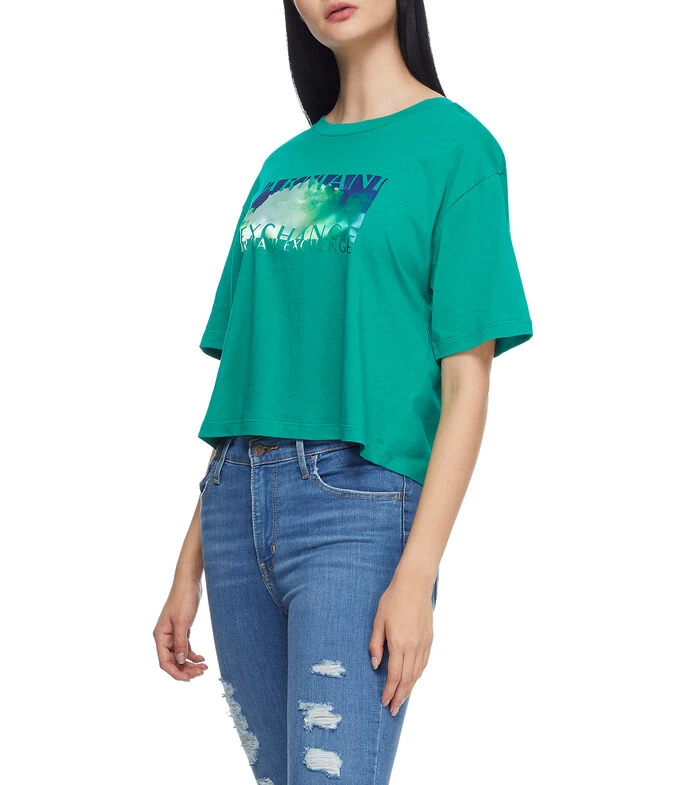 Playera Armani Exchange tipo Crop Top de corte Oversized en tejido de punto, cuello redondo, manga corta y estampado al frente a contraste.