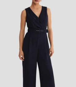 Jumpsuit BCBGeneration de corte recto en tejido de punto, cuello halter, hombros descubiertos, abertura en costados y espalda descubierta.