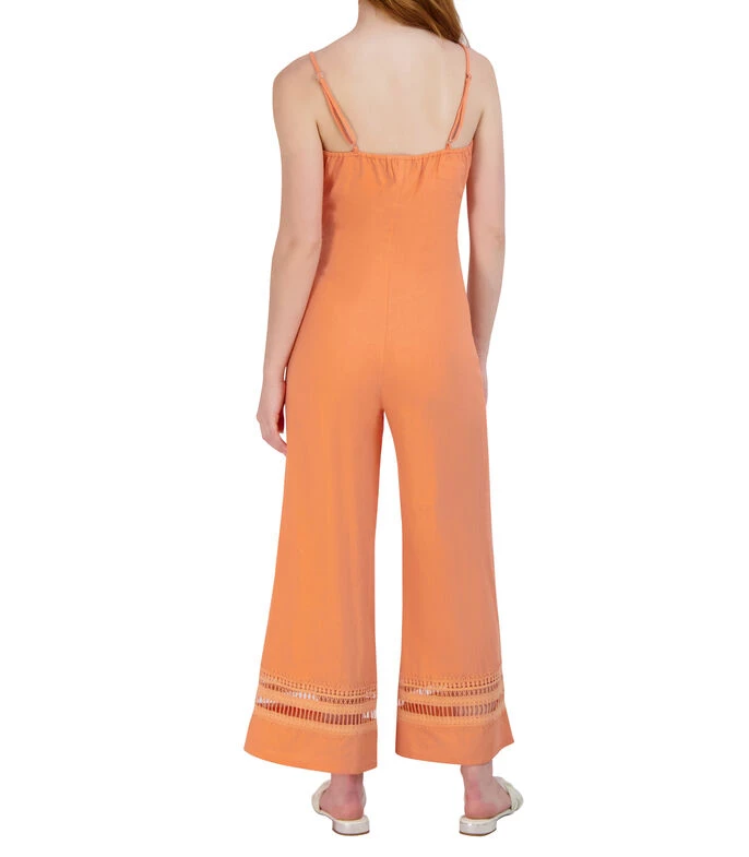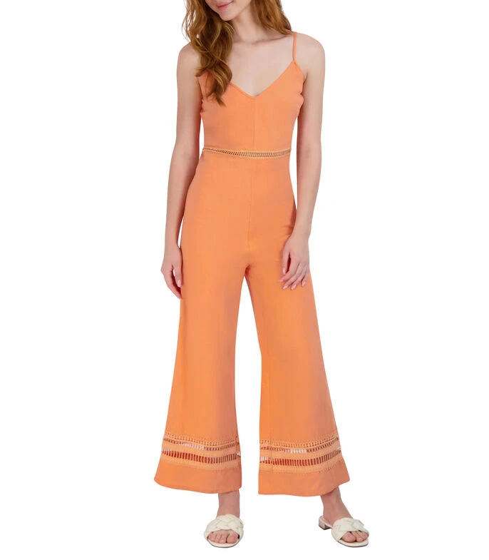 Jumpsuit BCBGeneration acampanado en tejido plano, cuello «V», dos tirantes delgados ajustables y texturas bordadas a en medio y al final de la prenda.