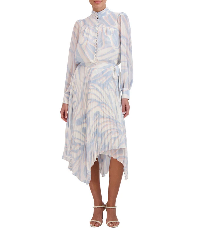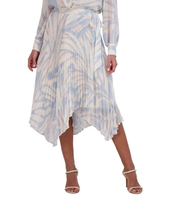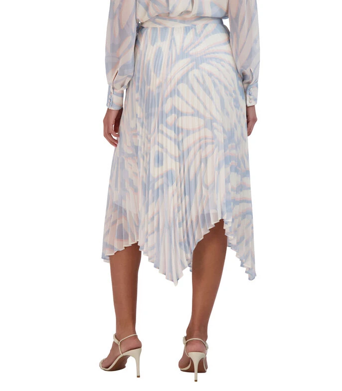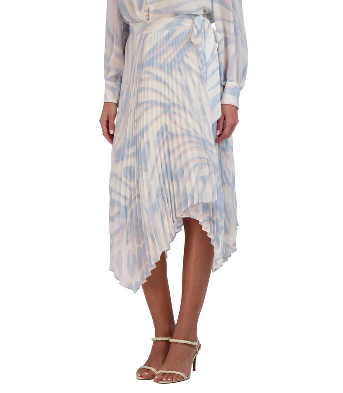 Falda larga BCBGMAXAZRIA de corte recto en tejido de punto plisado con diseño abstracto y nudo en costado.