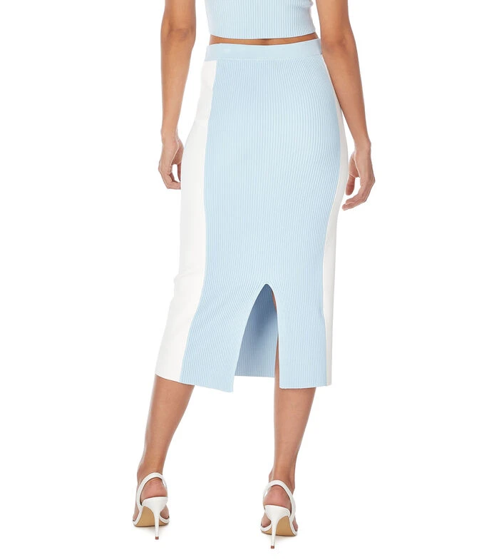 Falda larga BCBGMAXAZRIA de corte recto en tejido de punto canalé con bloque de color y pretina elástica.