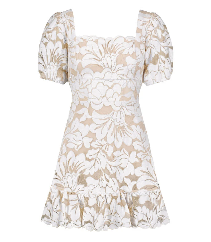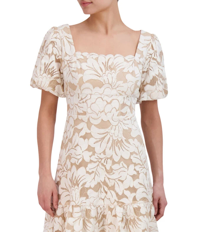 Vestido BCBGMAXAZRIA corto de corte recto, diseño decorativo floral, cuello cuadrado, manga corta abullonada, detalle en borde inferior y cremallera en espalda.