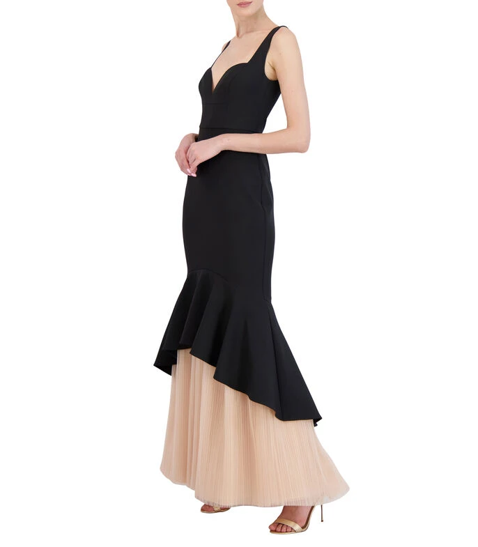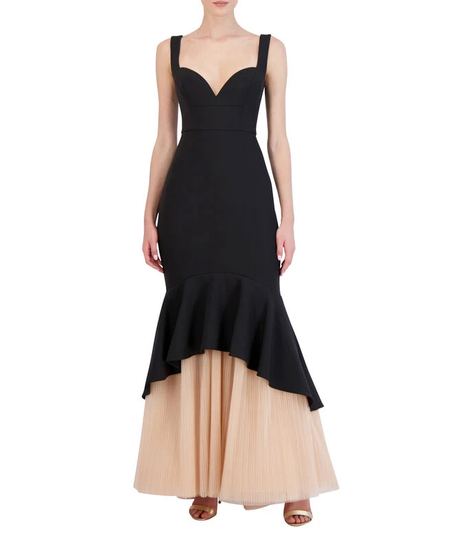 Vestido de fiesta BCBGMAXAZRIA largo de corte imperio en tejido de punto, escote corazón, sin mangas, tirantes medianos, diseño con bloques de color y textura en holán decorativo del borde inferior.