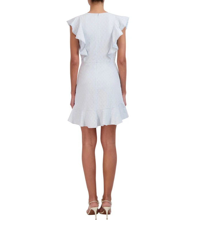 Vestido mini BCBGMAXAZRIA de corte evasé en tejido de punto con bordados, cuello «V» y holanes en costados.