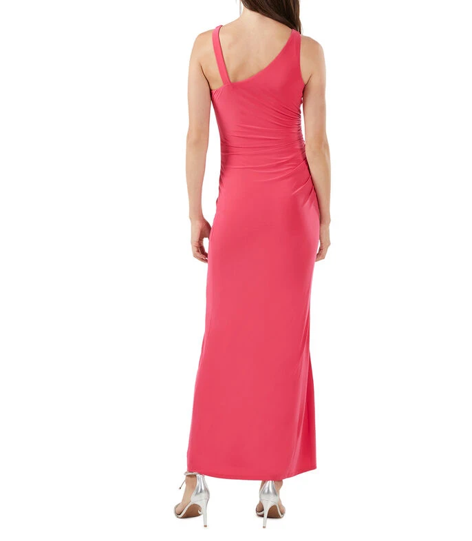 Vestido de Noche BCBGMAXAZRIA largo de corte ajustado en tejido de punto con cuello asimétrico, frunce decorativo en costado y abertura inferior.