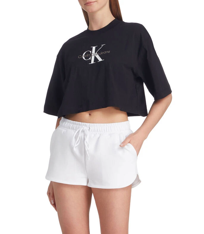 Playera Calvin Klein Jeans tipo Crop Top, de corte Oversize en tejido de punto, cuello redondo, manga corta y estampado al frente a contraste.