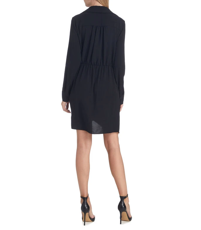 Vestido midi Calvin Klein de corte recto en tejido de punto, cuello camisero, manga larga, puño simple, broche en pecho, cinta decorativa en cintura y elástico en posterior.