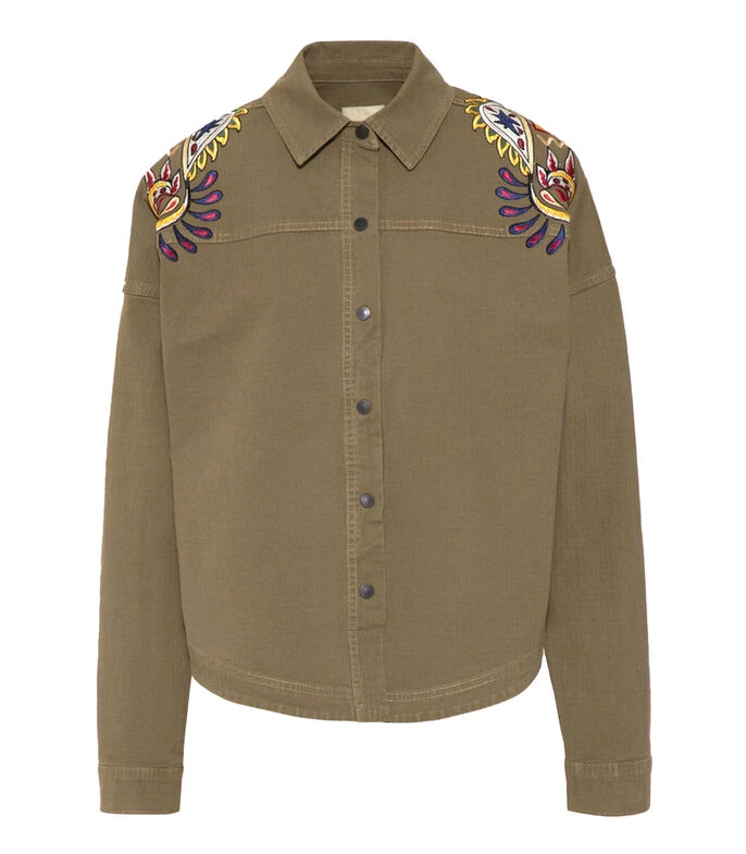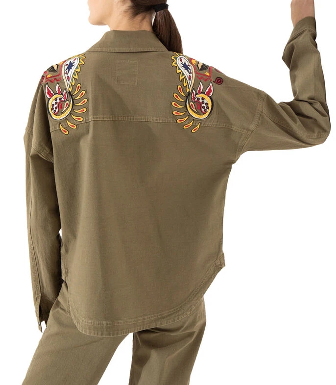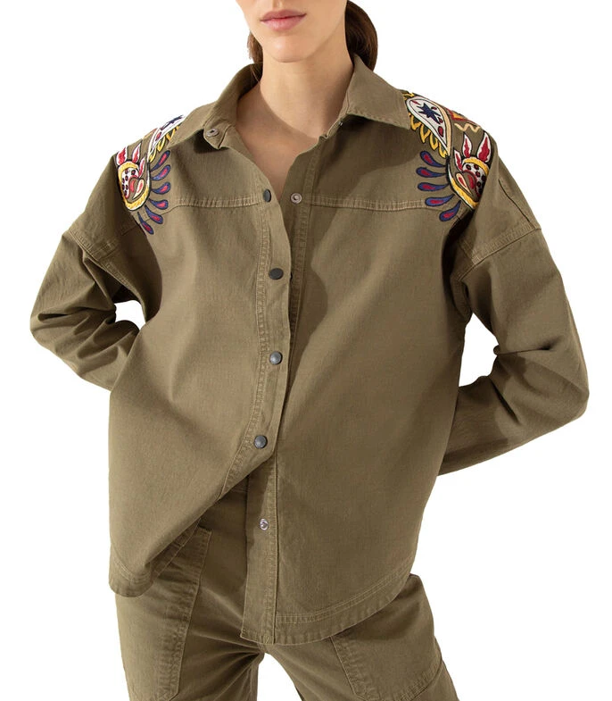 Camisa Jazmin Chebar de corte regular en tejido de punto con bordados en hombros, botones a contraste y puño simple.