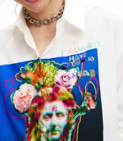 Camisa Jazmin Chebar confeccionada 100% en algodón con estampado Lucky Riders. De corte recto. Con cuello camisero clásico y botones centrales en el frente. Posee tajos en los laterales que aportan amplitud y vuelo a la prenda.