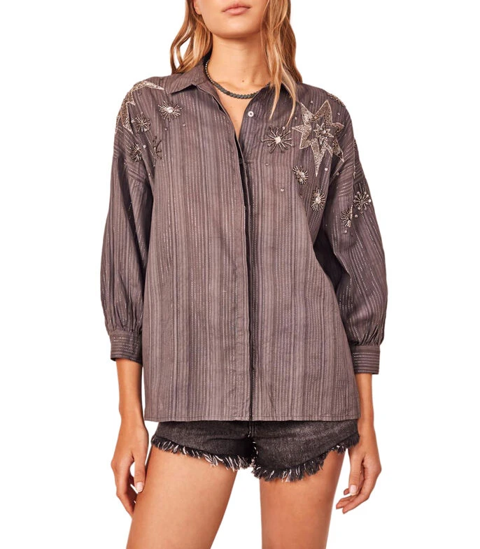 Camisa Rapsodia de corte regular en tejido de punto, rayas verticales con bordado superior y aplicación de chaquira a contraste, cuello camisero, manga 7/8 abullonada, puño simple, botonadura oculta. Súmale un toque rockero y con brillo a tu camisa de temporada.