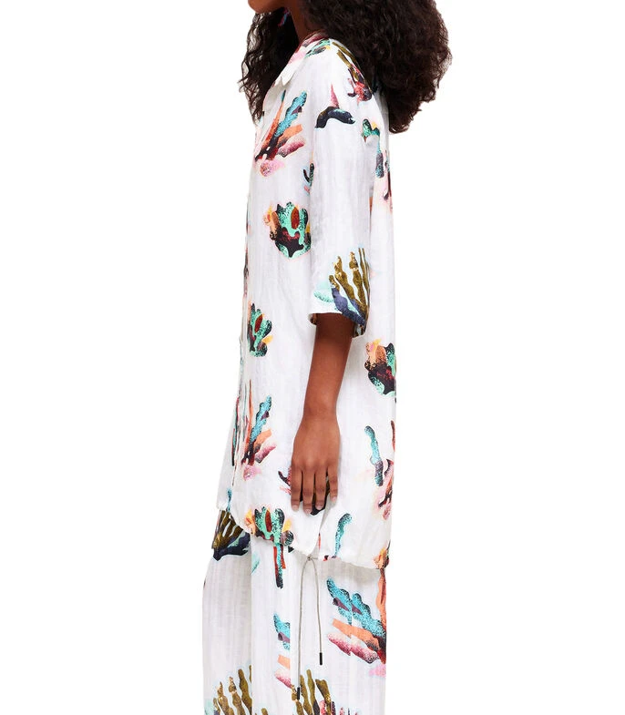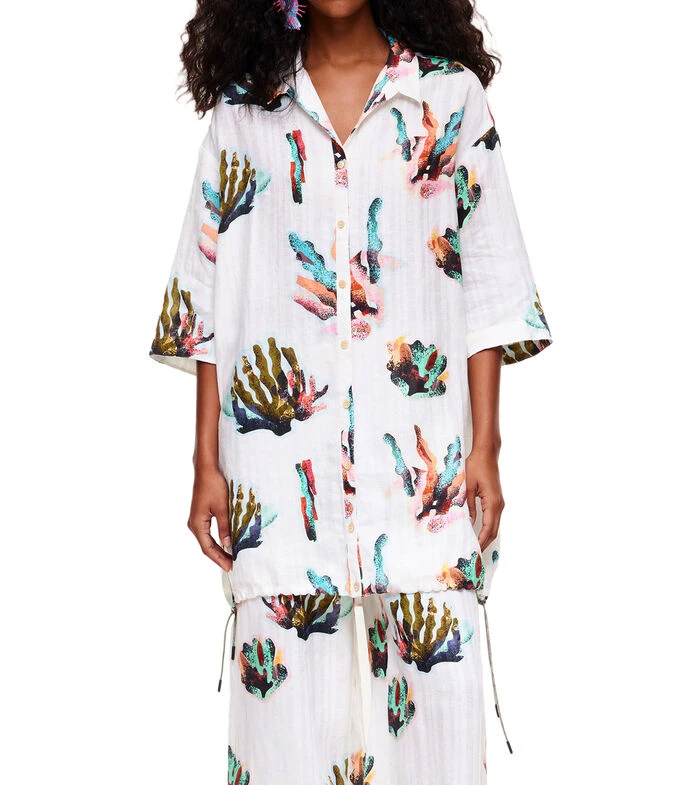 Camisa larga Bimba y Lola de corte oversized con Corales en mosaico. Diseño con manga amplia y cuello camisero. Cierre con botonadura frontal y cordones laterales.