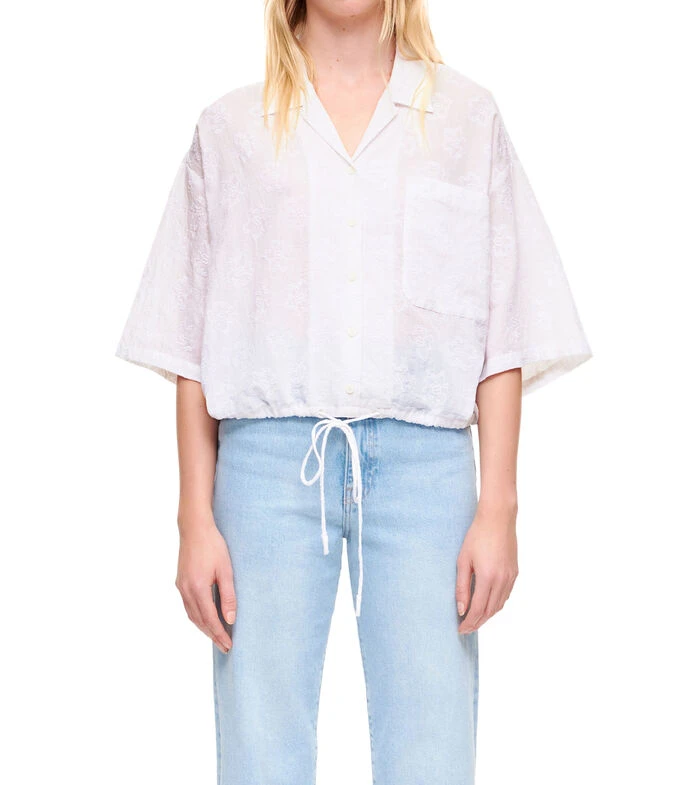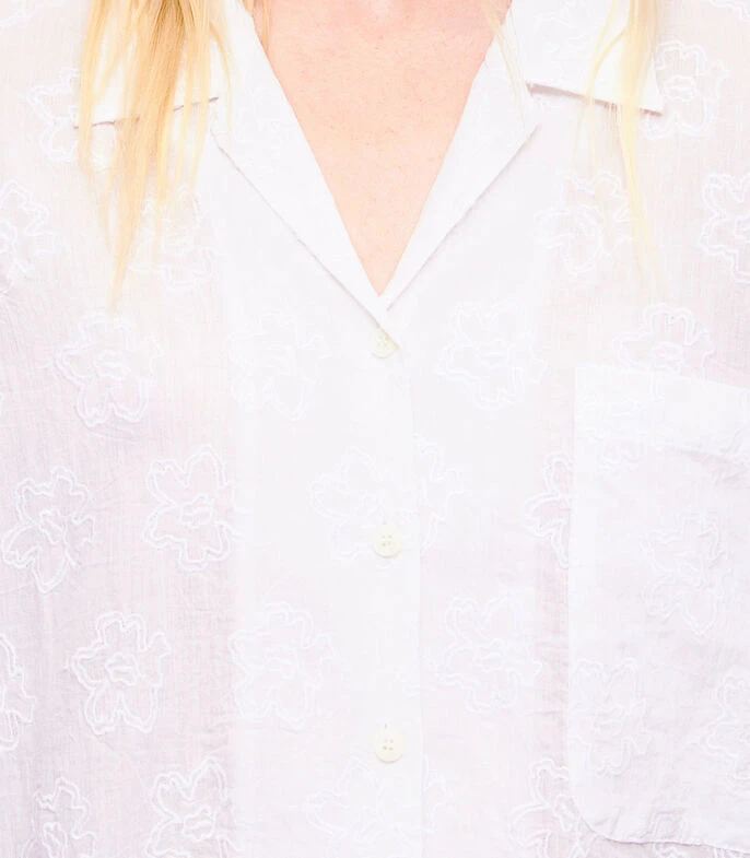 Camisa Bimba y Lola de corte oversize en tejido de punto, cuello camisero, manga 3/4, bolsillo en parche y jareta ajustable inferior.