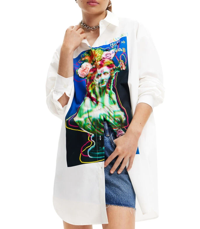 Camisa larga Desigual de corte oversized en tejido de punto con estampado fotográfico “arty” y un mensaje «Always have flowers in my head» bordado en la parte delantera.