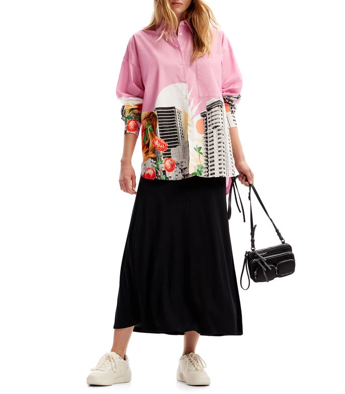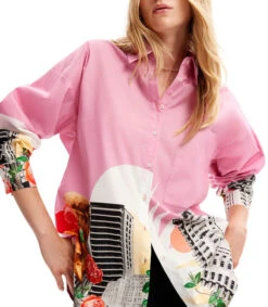 Camisa Desigual de corte Oversize en tejido de punto, cuello camisero, manga larga con puño simple, botonadura completa, bolsillo de parche y estampado a contraste.