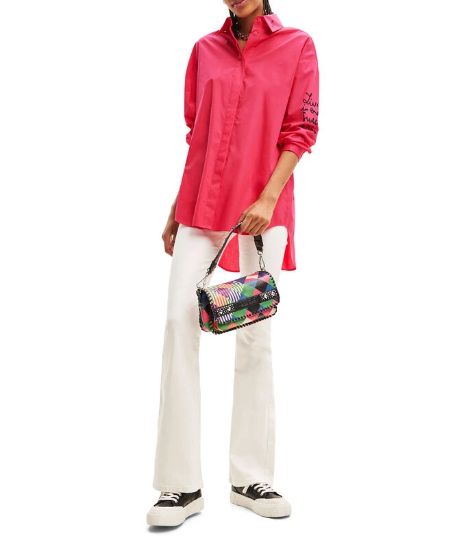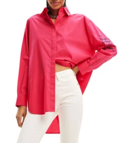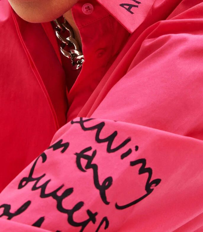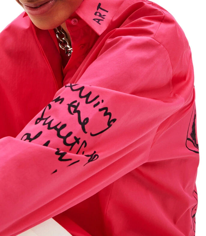 Camisa Desigual de corte oversized en tejido de punto con estampado de caras efecto pintado a mano del diseñador Javier Mariscal, cuello camisero y manga larga.