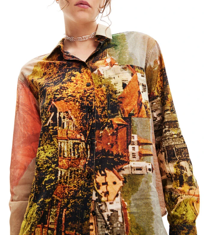 Camisa Desigual de corte regular en tejido de punto con fino estampado de paisaje, cuello camisero, manga larga, bolsillo de parche y puño doble. Diseñada por M. Christian Lacroix.