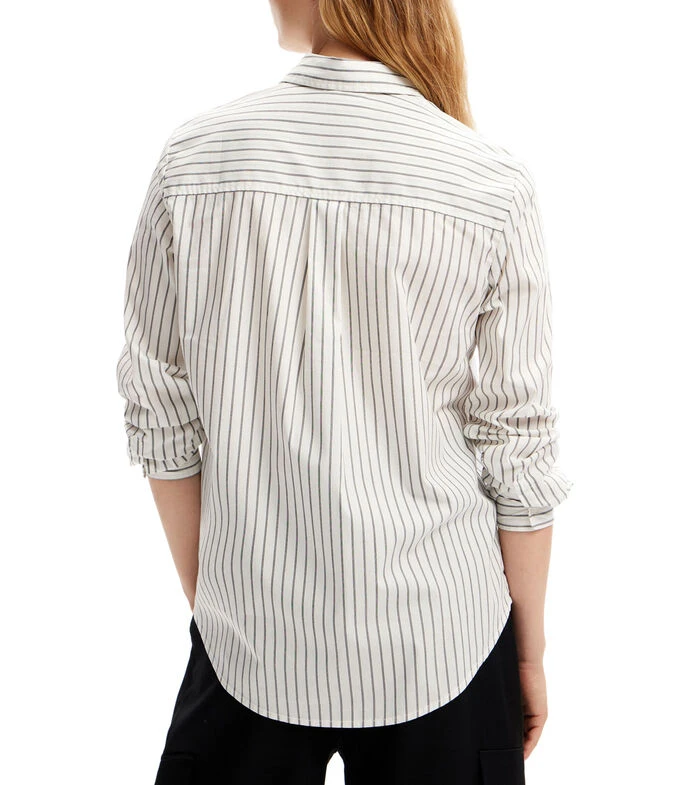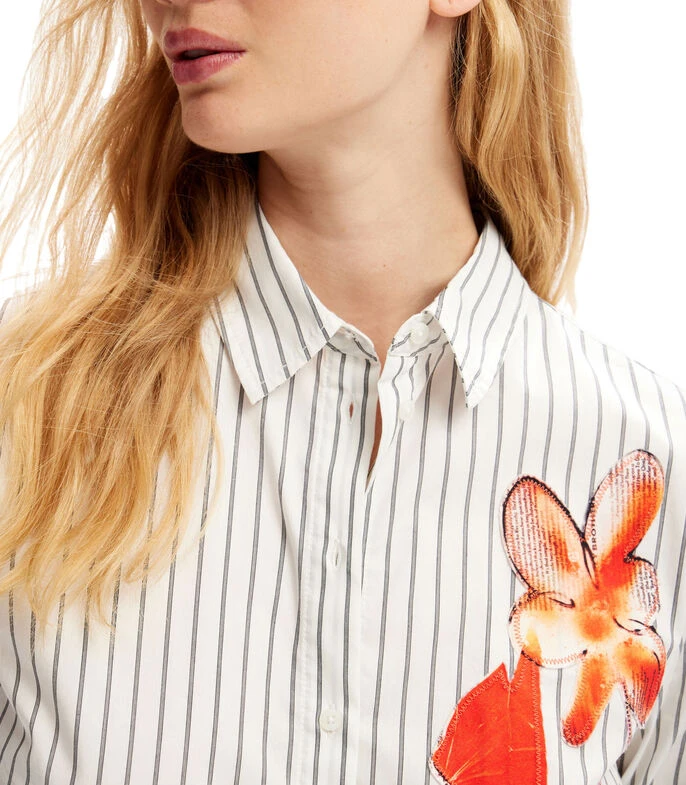 Camisa Desigual de corte regular en tejido de punto con rayas y estampado arty con parche de flor estampado periódico y efecto handmade, cuello camisero, botonadura a tono, detalle de mensaje bordado en bajo y manga larga; Somos un miembro orgulloso de la Better Cotton Initiative. Al comprar prendas de algodón de Desigual se apoya un cultivo de algodón más sostenible.