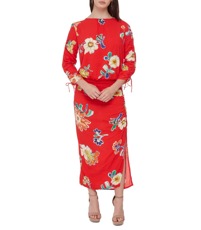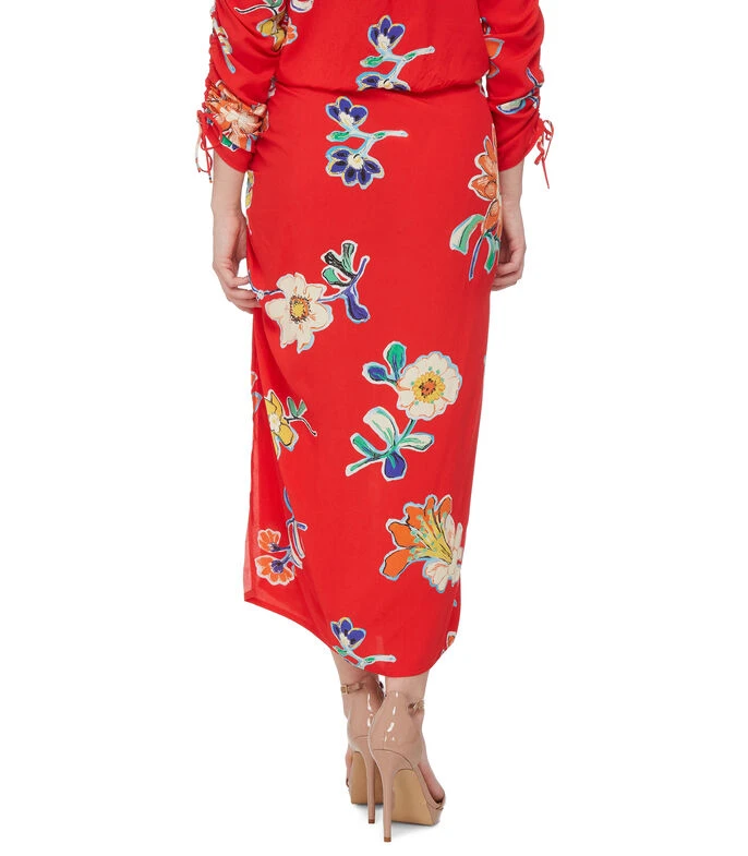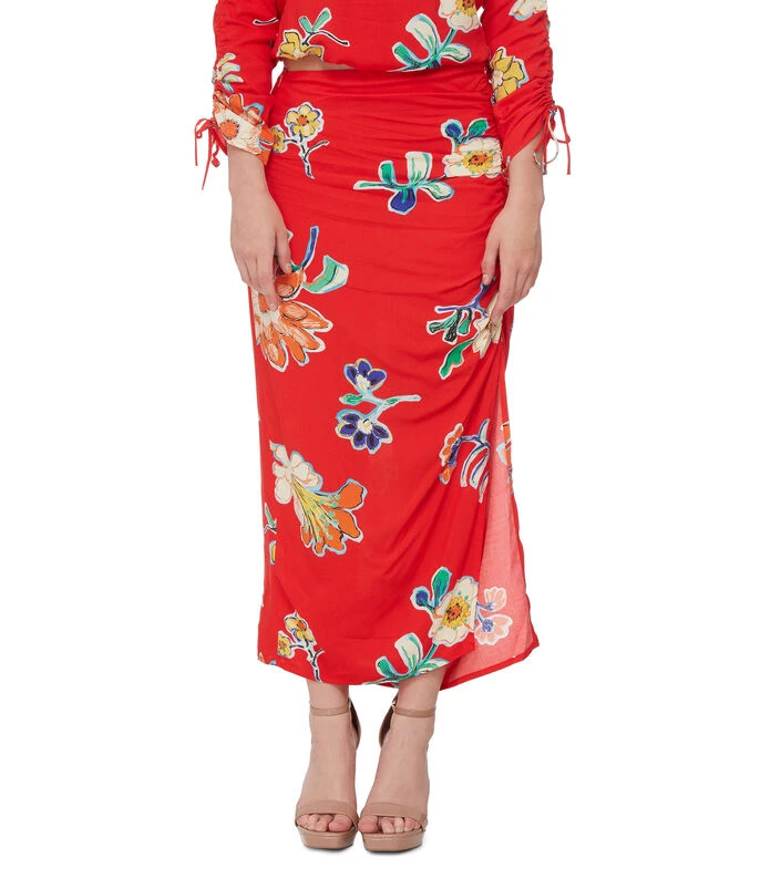 Falda midi Desigual de corte ajustado en tejido de punto floral, drapeado en costado con abertura decorativa y cierre oculto.
