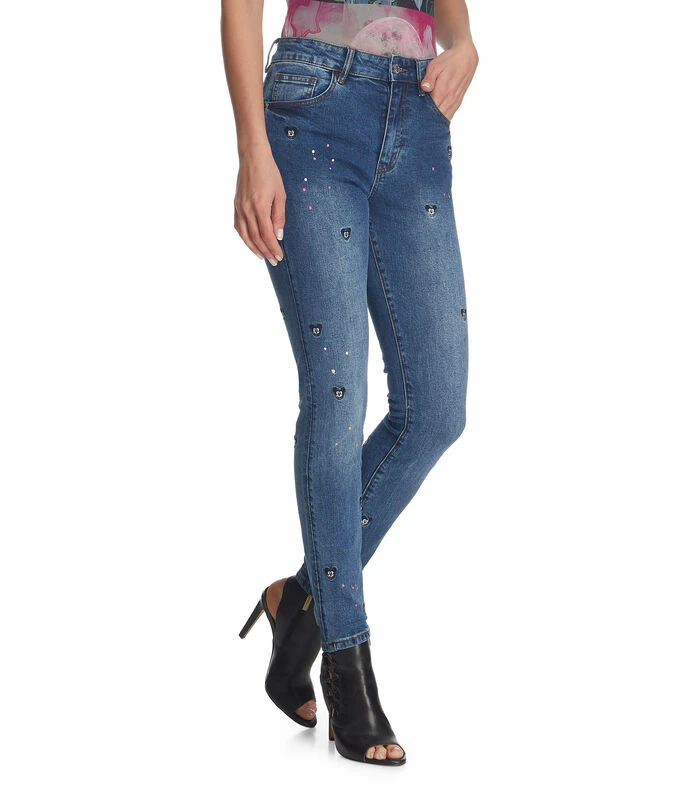Jeans Desigual Mickey de corte skinny con sutil diseño deslavado, bordado alusivo al modelo en cuerpo, trabillas para cinturón, cierre de cremallera con botón metalizado y pespuntes a contraste.