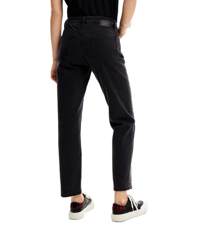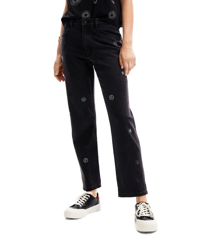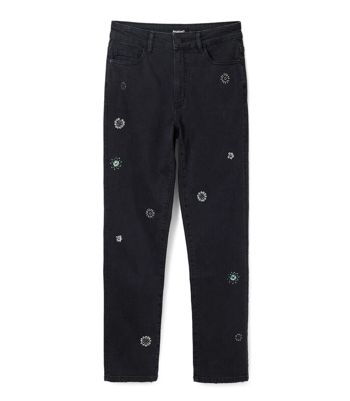 Jeans Desigual Ámsterdam de corte recto con trabillas, figuras geométricas formadas por cuentas y lentejuelas, botón a tono, cierre de cremallera.