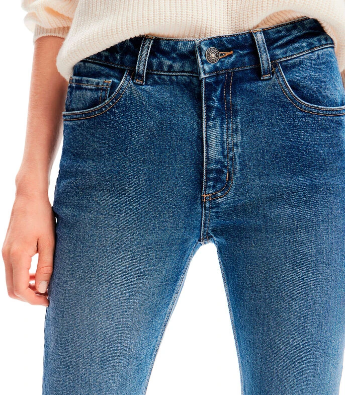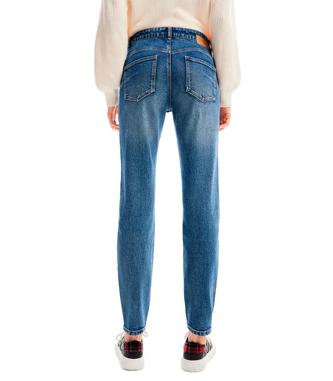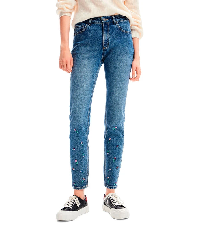 Jeans Desigual Viena de corte slim con diseño ligeramente deslavado, pespuntes a contraste, remaches metálicos y pequeñas flores bordadas en parte inferior.