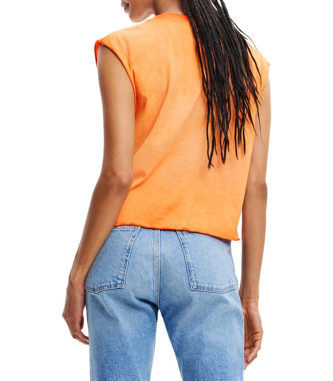 Playera Desigual de corte sin mangas con efecto lavado, ilustración de la tierra y mensaje bordado.