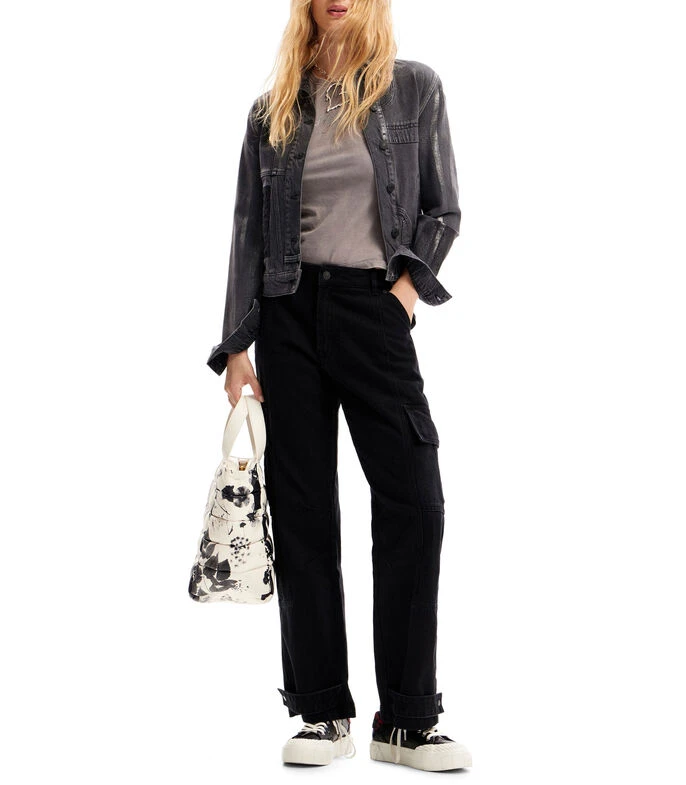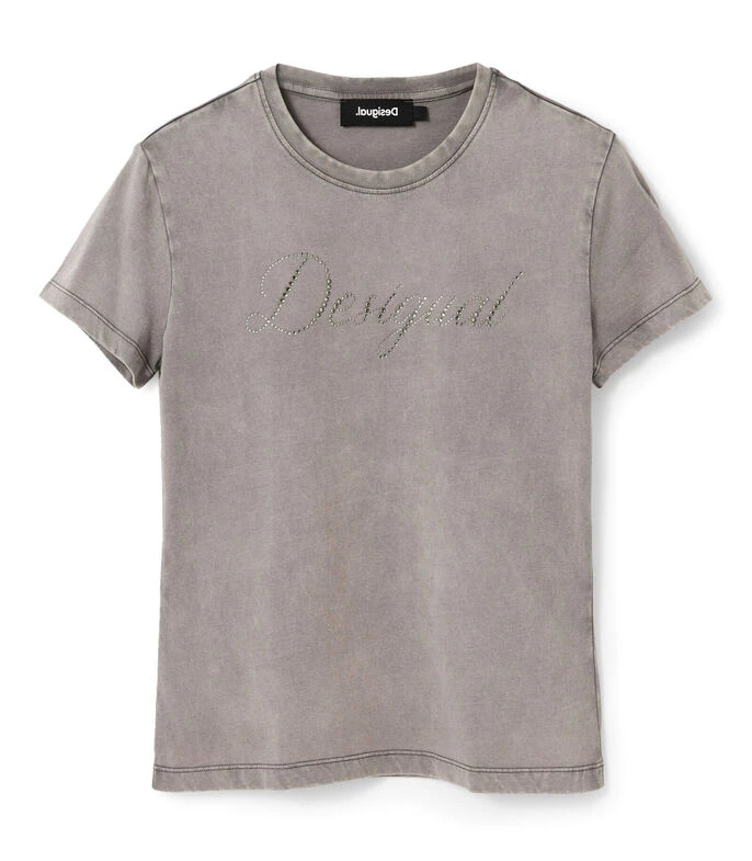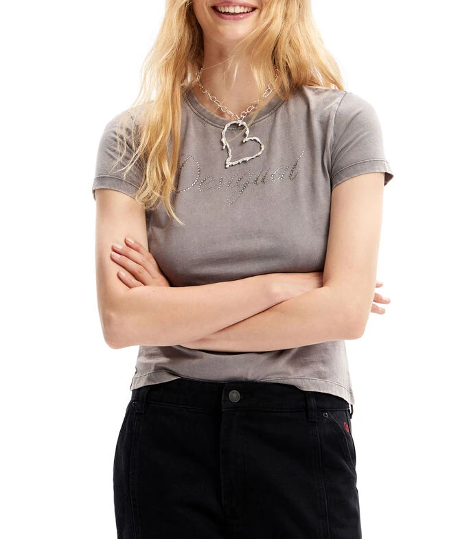 Playera Desigual de corte regular en tejido de punto jaspeado, nombre de la marca con strass a tono, cuello redondo y manga corta.