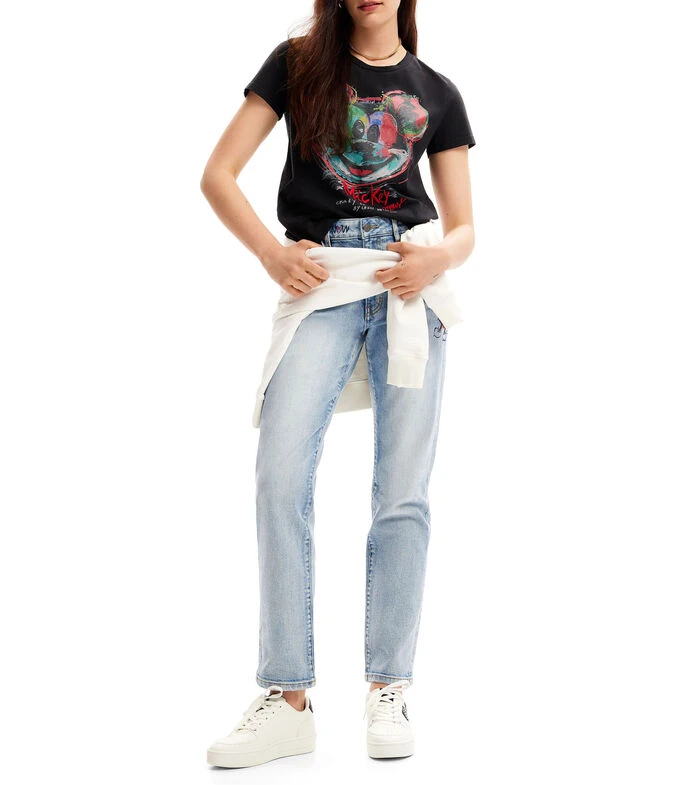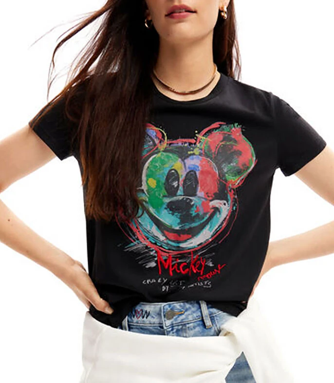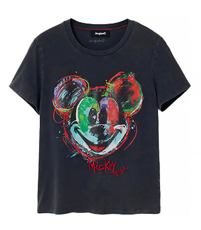 Playera Desigual Mickey Arty; Es una playera de manga corta con estampado frontal multicolor alusivo a Mickey Mouse, el icónico personaje Disney, con detalle bordado y mensaje.