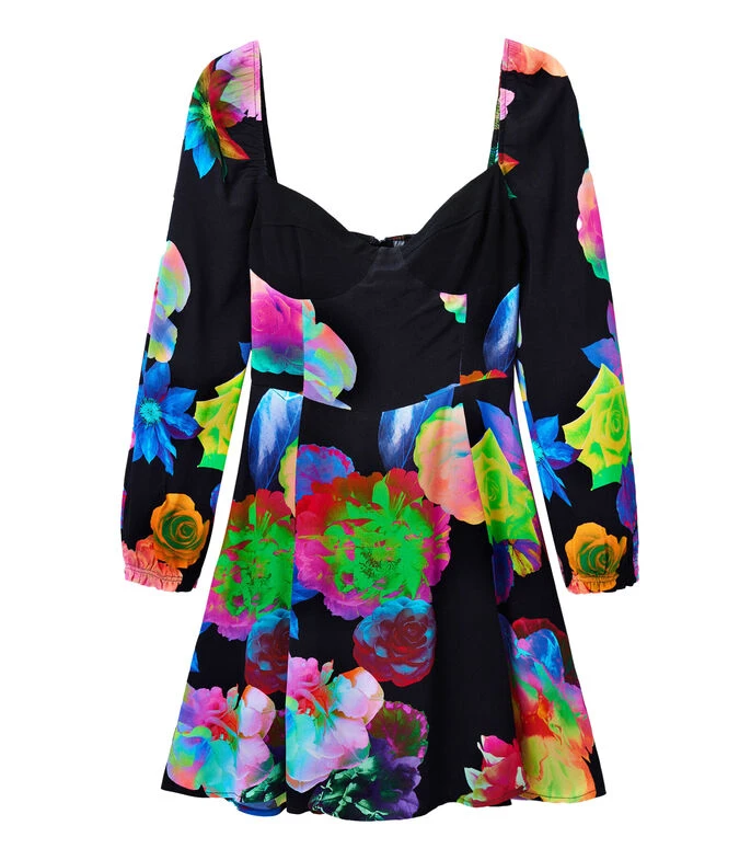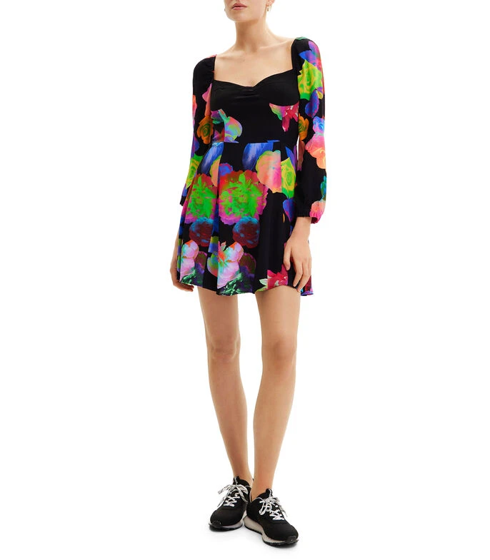 Vestido Desigual corto de corte «A» en tejido de punto con flores, manga larga abullonada y elástico plisado en espalda.