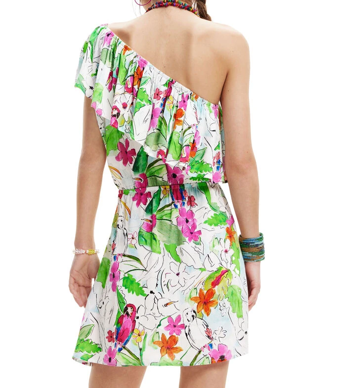 Vestido Desigual corto de corte recto en tejido de punto con diseño tropical arty en mosaico, cuello asimétrico, sin mangas, con holán en el escote y falda cruzada.