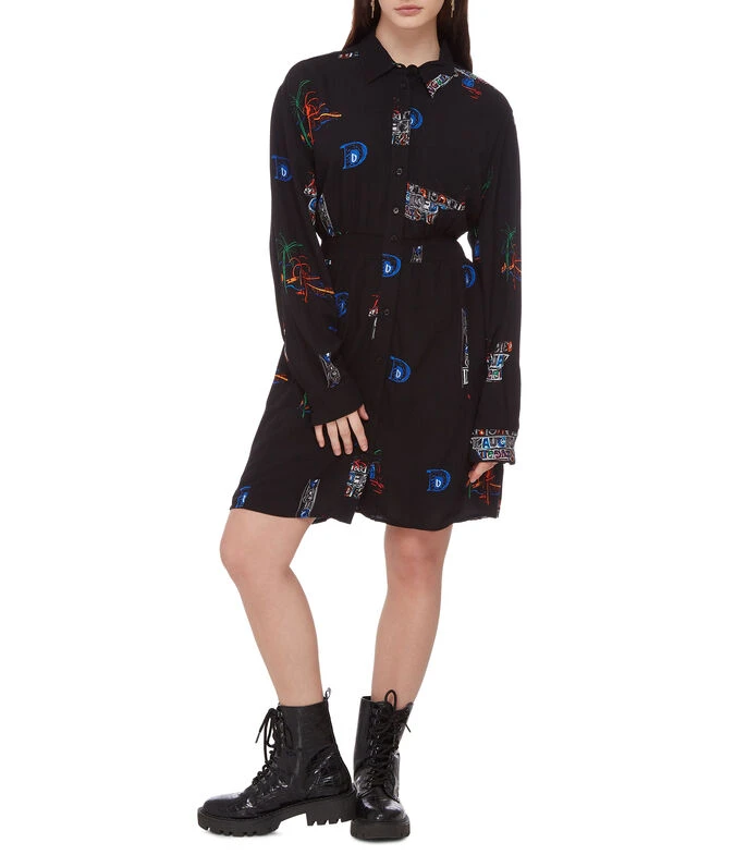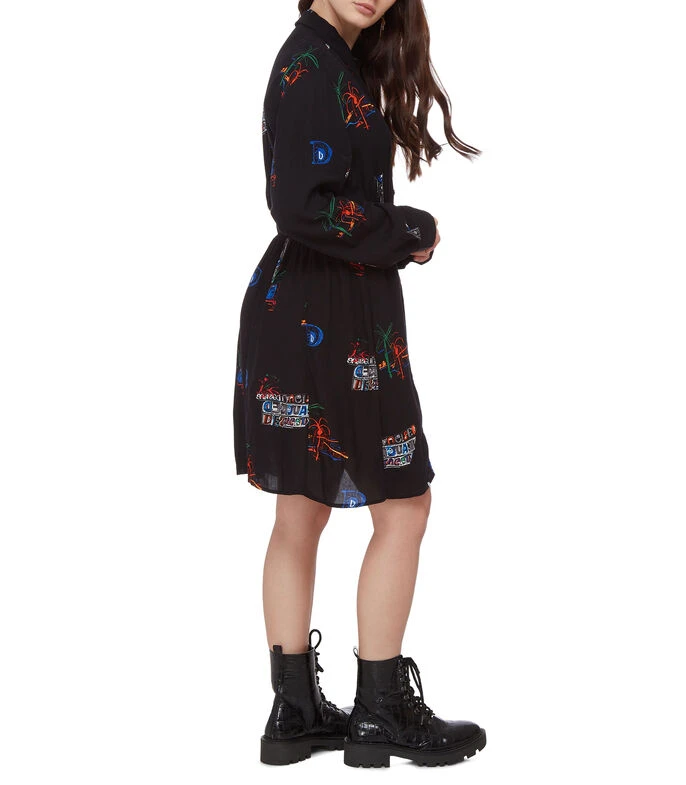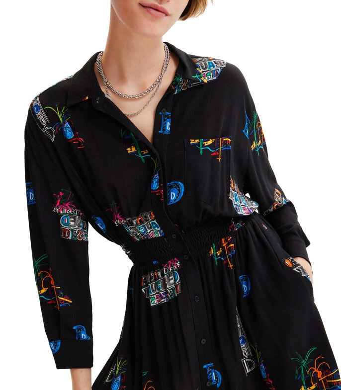 Vestido midi Desigual de corte «A» en tejido de punto, tipografía a contraste, botonadura y elástico en cintura.