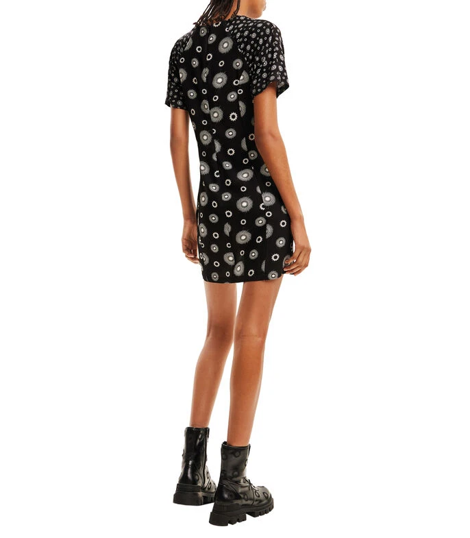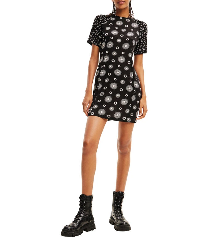 Vestido Desigual mini de corte recto en tejido de punto con estampado de motivos geométricos, cuello redondo y manga corta.
