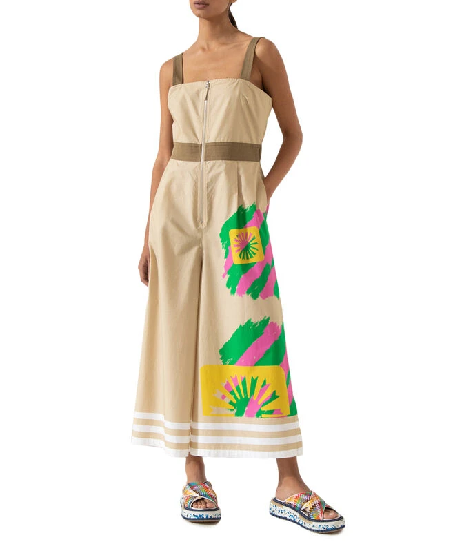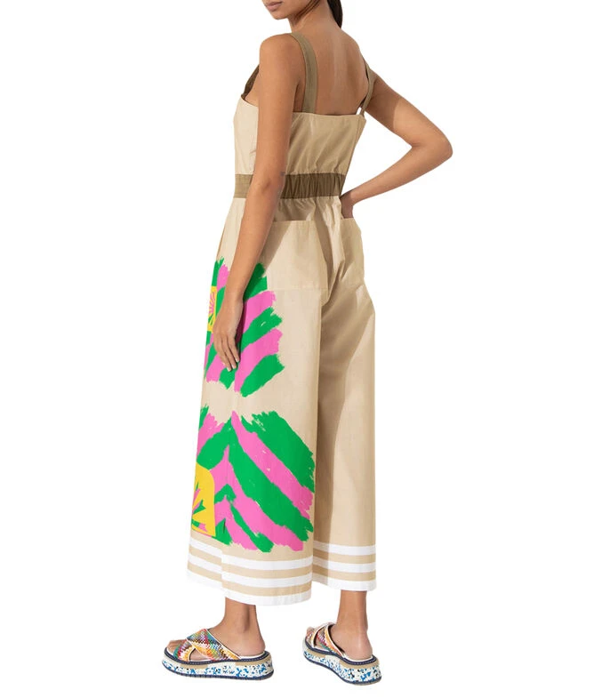 Enterito Jazmin Chebar con estampa Menina & Peace, diseñada exclusivamente para esta colección. Corte relajado con ajuste en la cintura y escote cuadrado. Posee breteles anchos y se accede mediante cierre en el centro delantero. Tiene bolsillos laterales y en espalda. Detalle de tajos en ruedo.