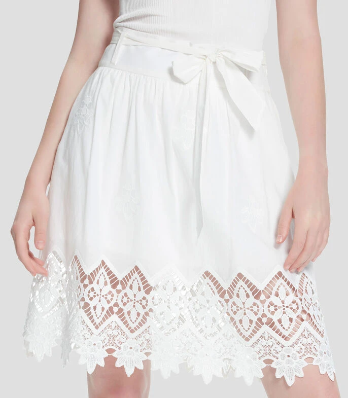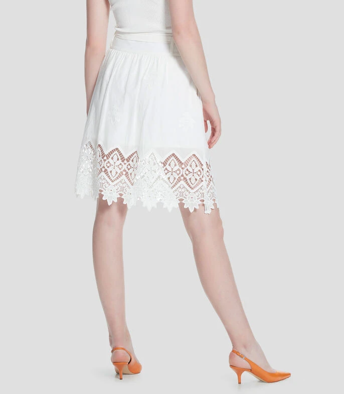 Falda corta Julio de corte A en tejido de punto con trabillas en pretina ancha y banda de tela. Cierre oculto y bolsillos en costados. Voile bordado con cenefa de crochet. Forro interior.
