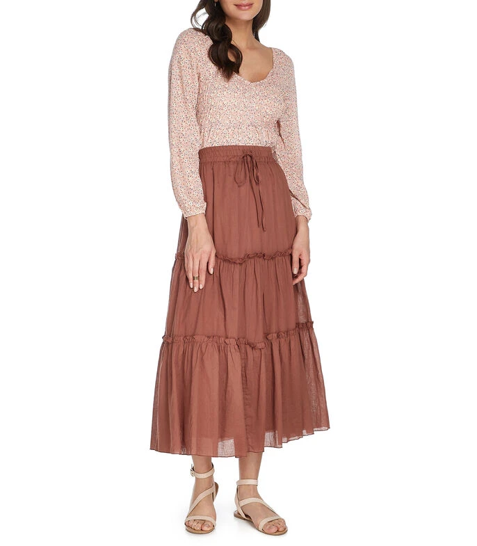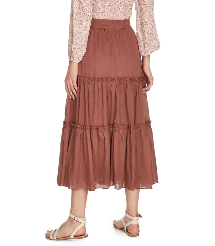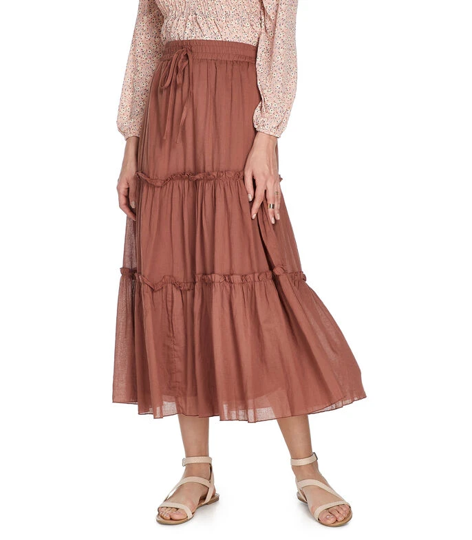 Falda larga Catamaran de corte A en tejido de punto, pretina elástica, holanes inferiores y jareta decorativa. Fondo a tono.