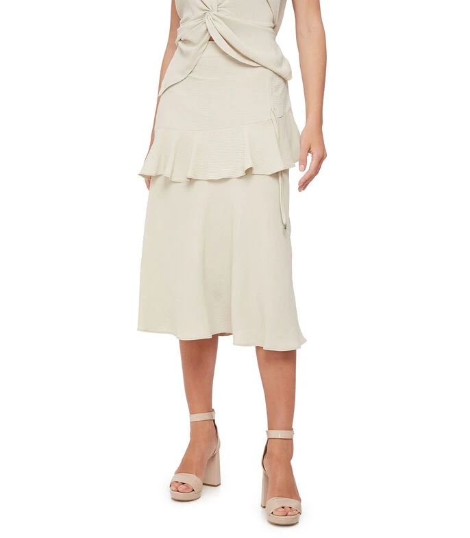 Falda midi Pórtico de corte recto en tejido plano, inserción de hilo metalizado, pretina elástica y holanes a tono.