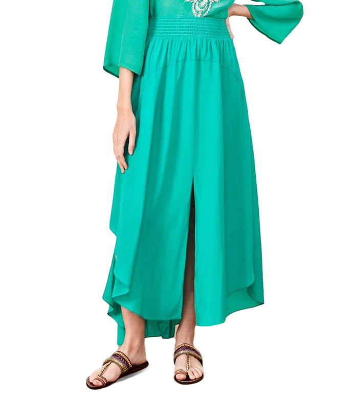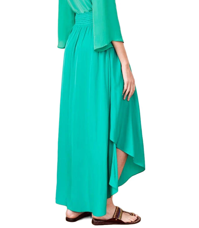 Falda Midi Rapsodia de corte «A» en tejido de punto, pretina elástica y diseño asimétrico. Con una caída delicada y mucho movimiento, esta falda es relajada y versátil, además de sumar un estilo boho a tu outfit.