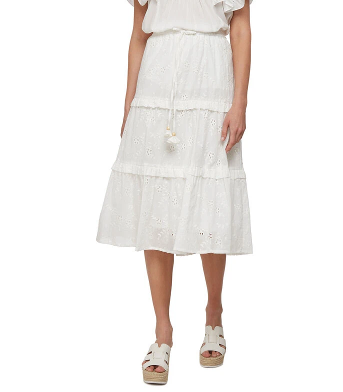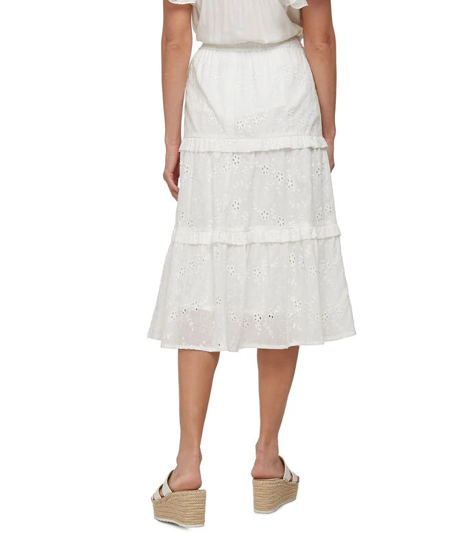 Falda midi Pórtico de corte «A» en tejido de punto, diseño de encaje floral, holanes al frente y pretina elástica.