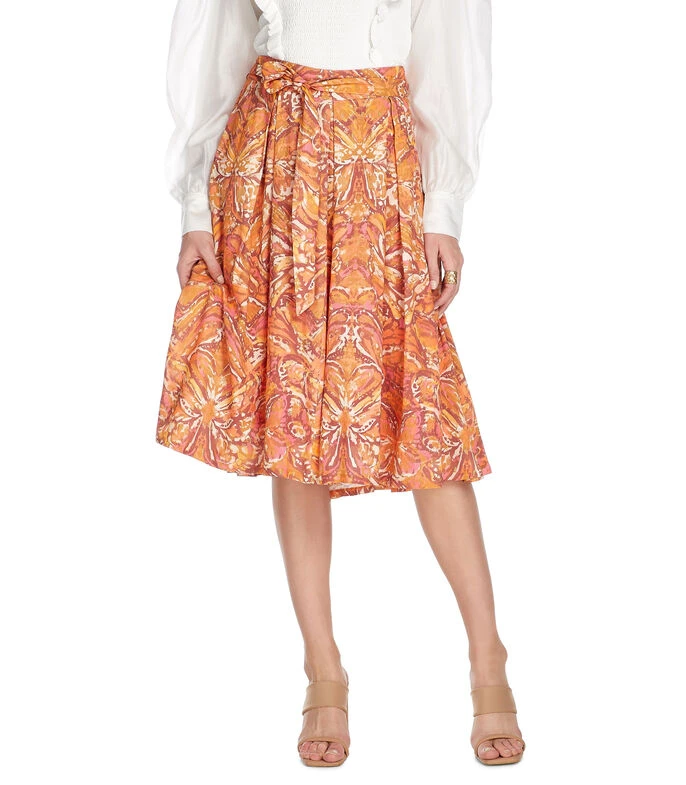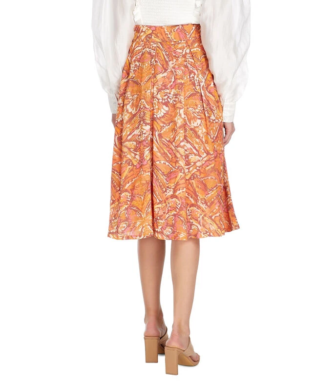 Falda Midi Chester & Peck de corte A en tejido de punto con estampado alusivo al modelo, cinta en cintura y medio cierre de cremallera en lateral.